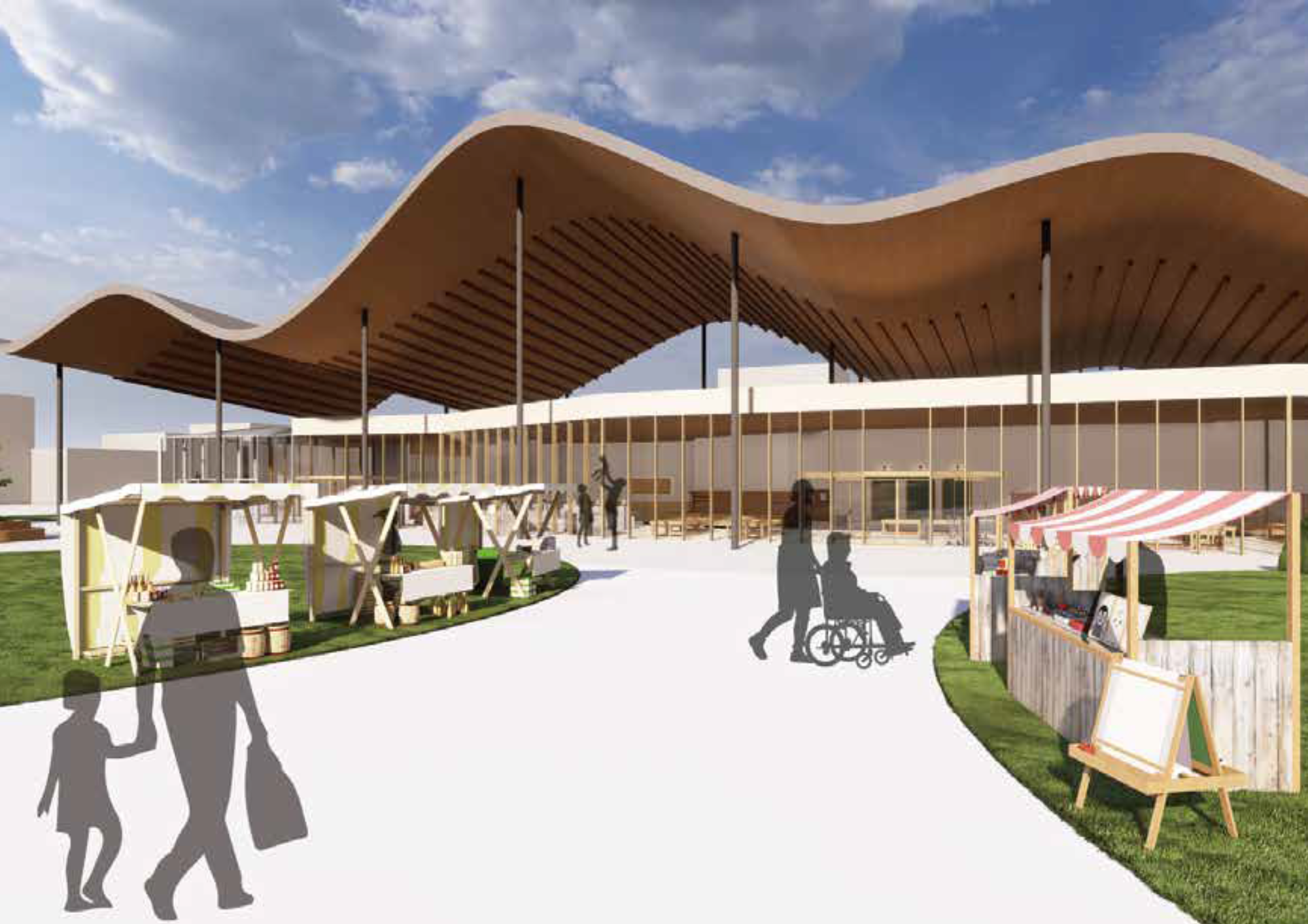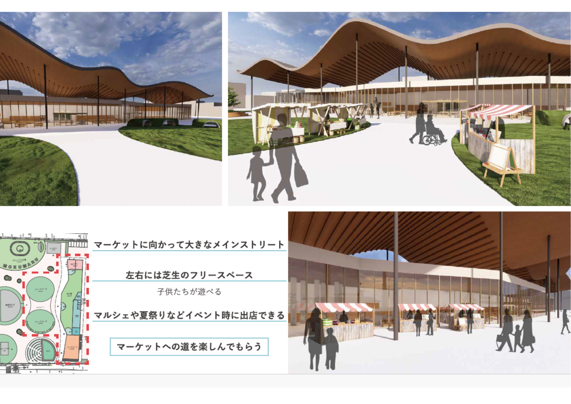 豊田市に新たに建設する大型複合施設の計画を提案する。JAファーマーズマーケット(直売所)とは、地元の新鮮・とれたて食材を販売する店舗。